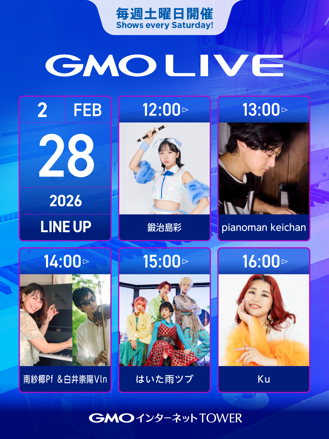 GMO LIVEでは、多くの才能あるミュージシャンたちの活動機会をサポートいたします。事前審査の上、ミュージシャン登録いただいた方々に、毎週土曜日にGMOインターネットTOWERのクリスタルピアノをはじめ、敷地内の複数の場所でギターやヴァイオリンなどさまざまな楽器を演奏していただくイベントです。 ミュージシャン自身によるインターネット上での演奏動画公開を参加条件とすることで、遠方の方にもオンラインで演奏を楽しんでいただいています。 詳細はオフィシャルサイトをご確認ください。