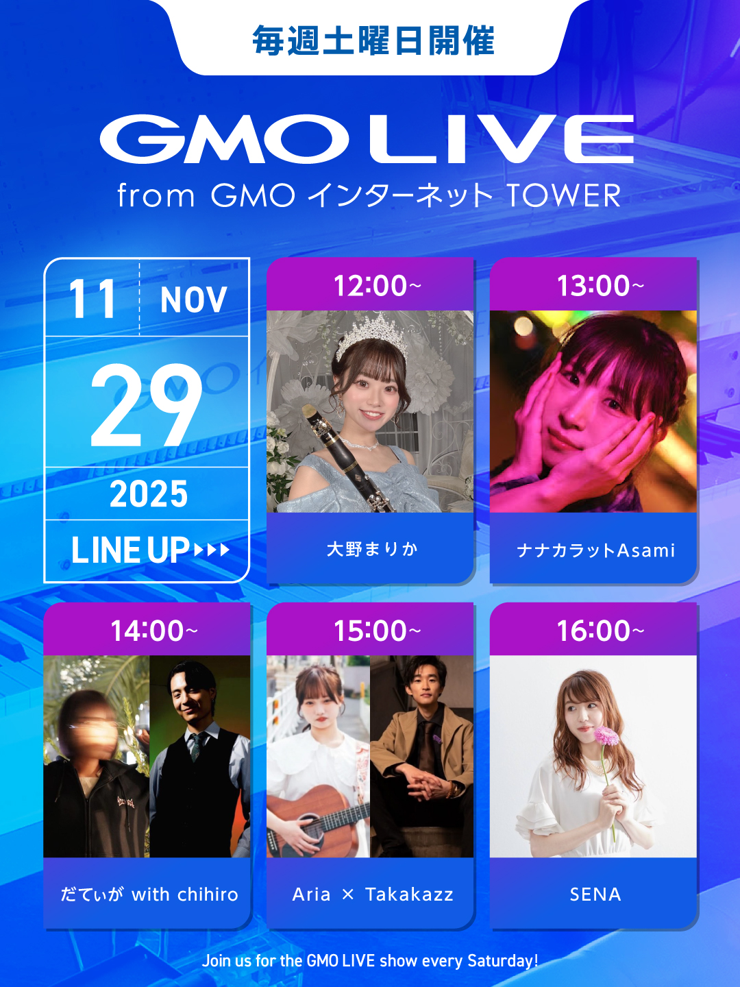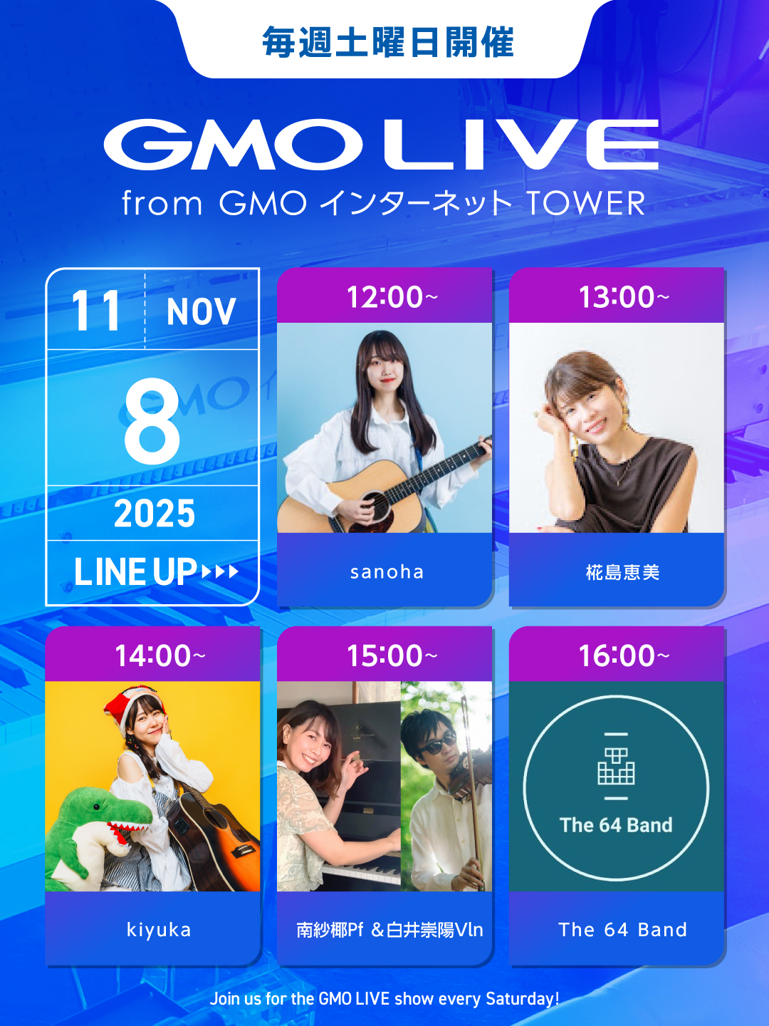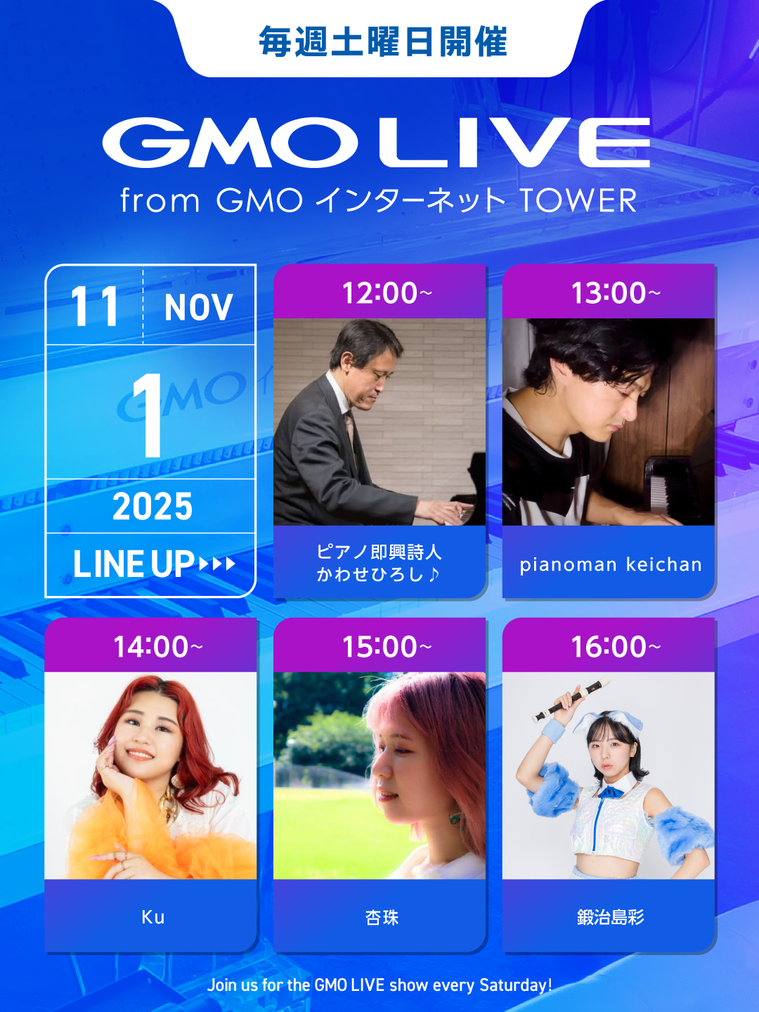 GMO LIVEでは、多くの才能あるミュージシャンたちの活動機会をサポートいたします。事前審査の上、ミュージシャン登録いただいた方々に、毎週土曜日にGMOインターネットTOWERのクリスタルピアノをはじめ、敷地内の複数の場所でギターやヴァイオリンなどさまざまな楽器を演奏していただくイベントです。 ミュージシャン自身によるインターネット上での演奏動画公開を参加条件とすることで、遠方の方にもオンラインで演奏を楽しんでいただいています。 詳細はオフィシャルサイトをご確認ください。