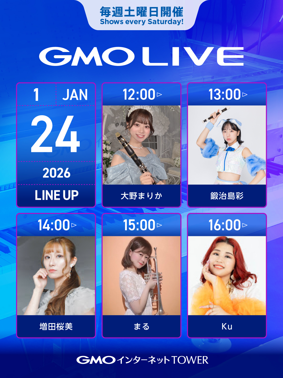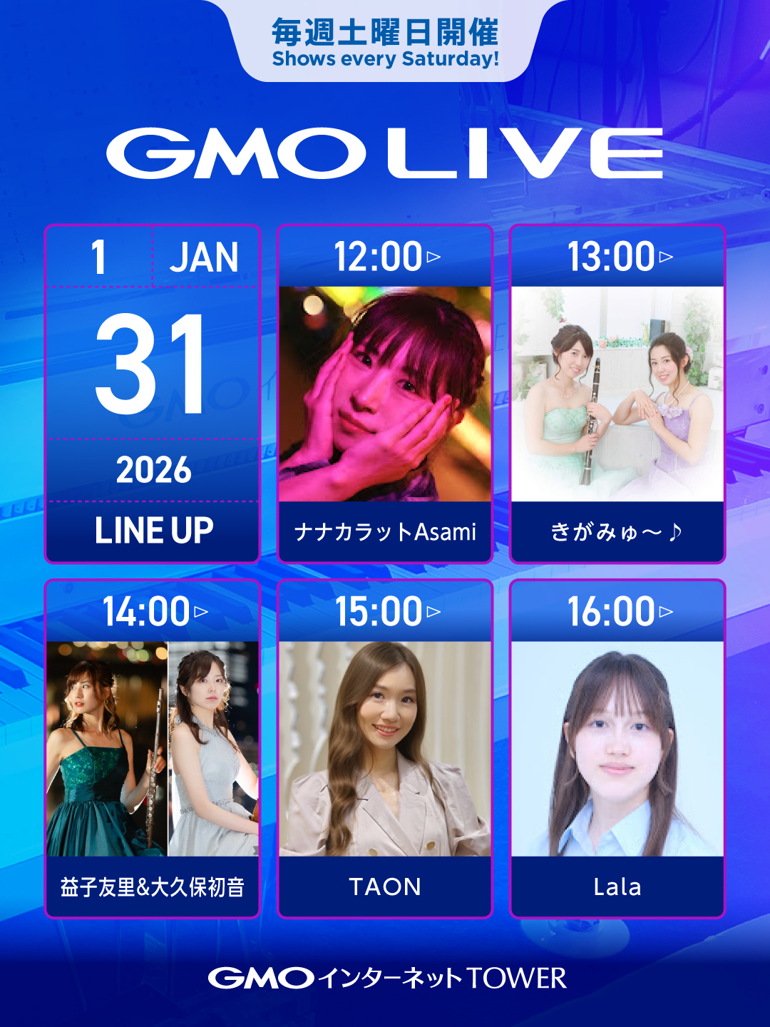 GMO LIVEでは、多くの才能あるミュージシャンたちの活動機会をサポートいたします。事前審査の上、ミュージシャン登録いただいた方々に、毎週土曜日にGMOインターネットTOWERのクリスタルピアノをはじめ、敷地内の複数の場所でギターやヴァイオリンなどさまざまな楽器を演奏していただくイベントです。 ミュージシャン自身によるインターネット上での演奏動画公開を参加条件とすることで、遠方の方にもオンラインで演奏を楽しんでいただいています。 詳細はオフィシャルサイトをご確認ください。